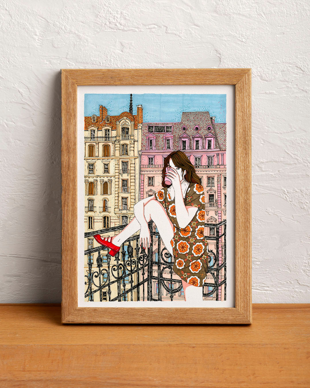 “Balcony” is a charming art print by Spanish illustrator Ana Jarén, depicting a serene urban scene—a woman in a floral dress sipping coffee on a balcony framed by pastel architecture. The illustration is full of small everyday details, offering a warm, feminine atmosphere that makes it a delightful piece of decoration.