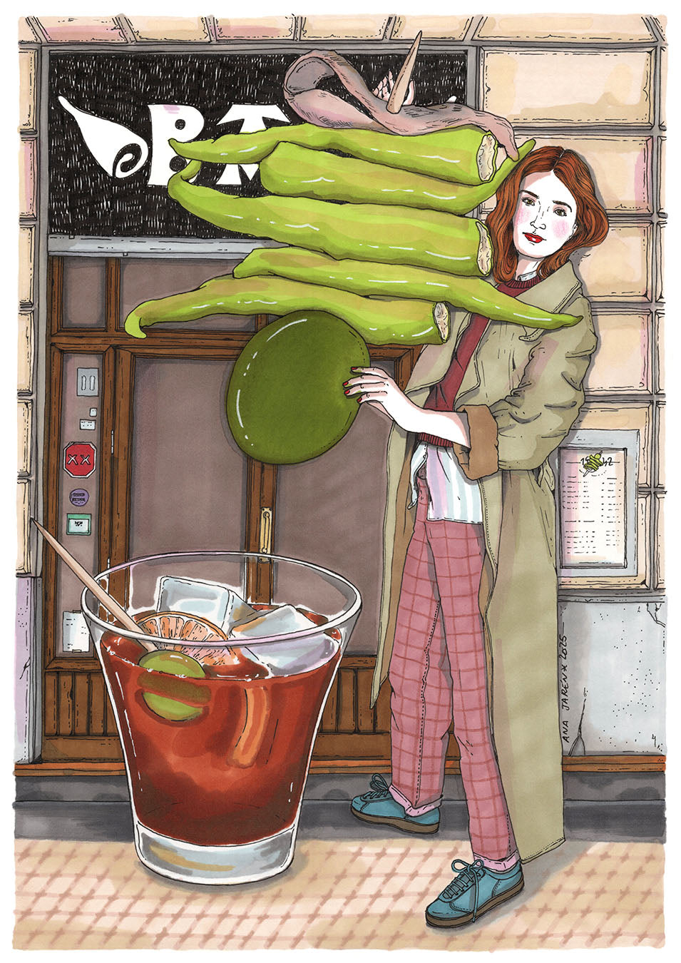 This charming illustration by Ana Jarén introduces us to Gilda, peacefully enjoying a moment of calm with two unmistakable icons of Spanish aperitivo culture: a gilda pintxo and a vermouth. Gentle lines and subtle tones create a warm, intimate scene that feels both nostalgic and inviting. It’s a quiet celebration of simple pleasures—the kind that make ordinary moments feel special.