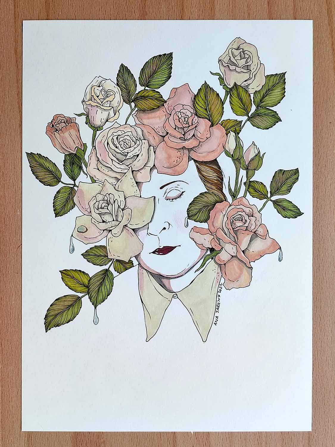 La escritora Elena Fortún aparece representada llorando y rodeada de rosas.