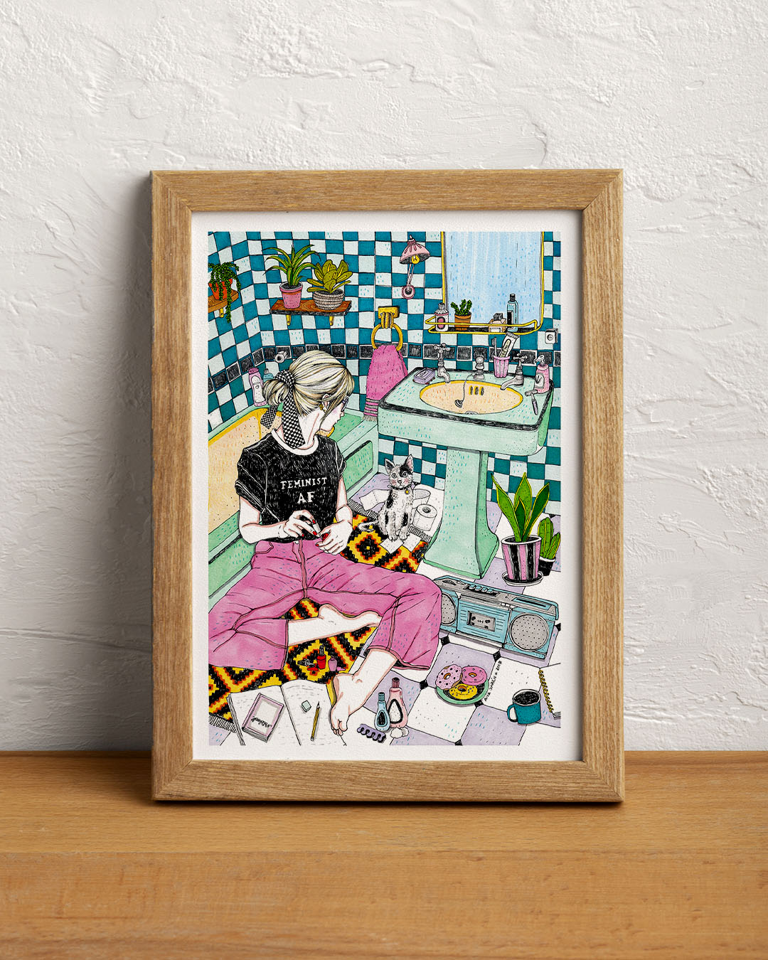 Feminista es una ilustración vibrante de la artista española Ana Jarén, que muestra una escena acogedora en la que una mujer recarga energías en casa—escuchando música, pintándose las uñas, escribiendo en su diario—rodeada de libros, plantas y una atmósfera tranquila e íntima. Esta obra celebra el autocuidado, el empoderamiento y los rituales cotidianos, convirtiéndose en una pieza reflexiva y con estilo para la decoración de interiores.