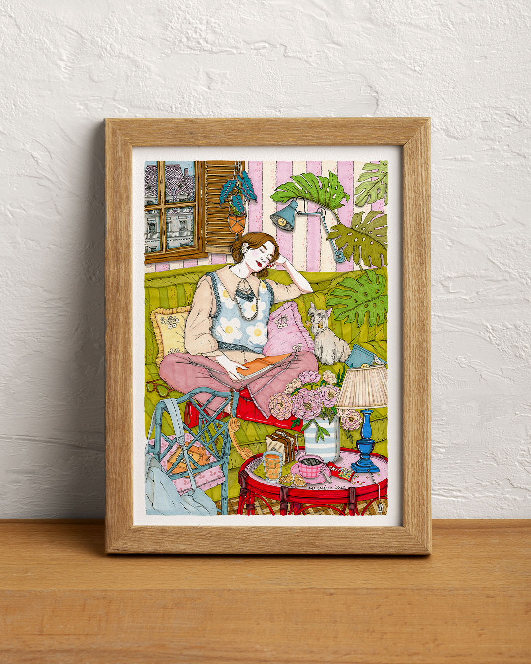 Siesta es una lámina de arte acogedora y reconfortante de la ilustradora Ana Jarén. La ilustración captura un tranquilo momento de media tarde: una mujer que se adormece con un libro—acompañada de gatos y cojines mullidos—perfecta para aportar una sensación de calma y encanto cotidiano como pieza de decoración en cualquier hogar o estudio.