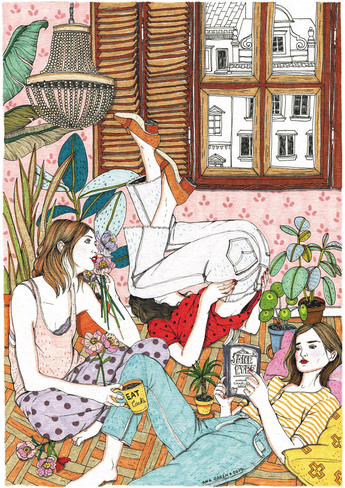 Tribu es una ilustración vibrante y afectuosa de la artista Ana Jarén. La escena muestra a tres mujeres compartiendo un momento en una habitación llena de plantas: una toma café, otra lee Jane Eyre y la tercera balancea las piernas con alegría. La imagen transmite la comodidad, la risa y la energía compartida de estar con tu tribu elegida. Es una pieza cálida y expresiva de decoración que celebra la amistad y la alegría cotidiana.