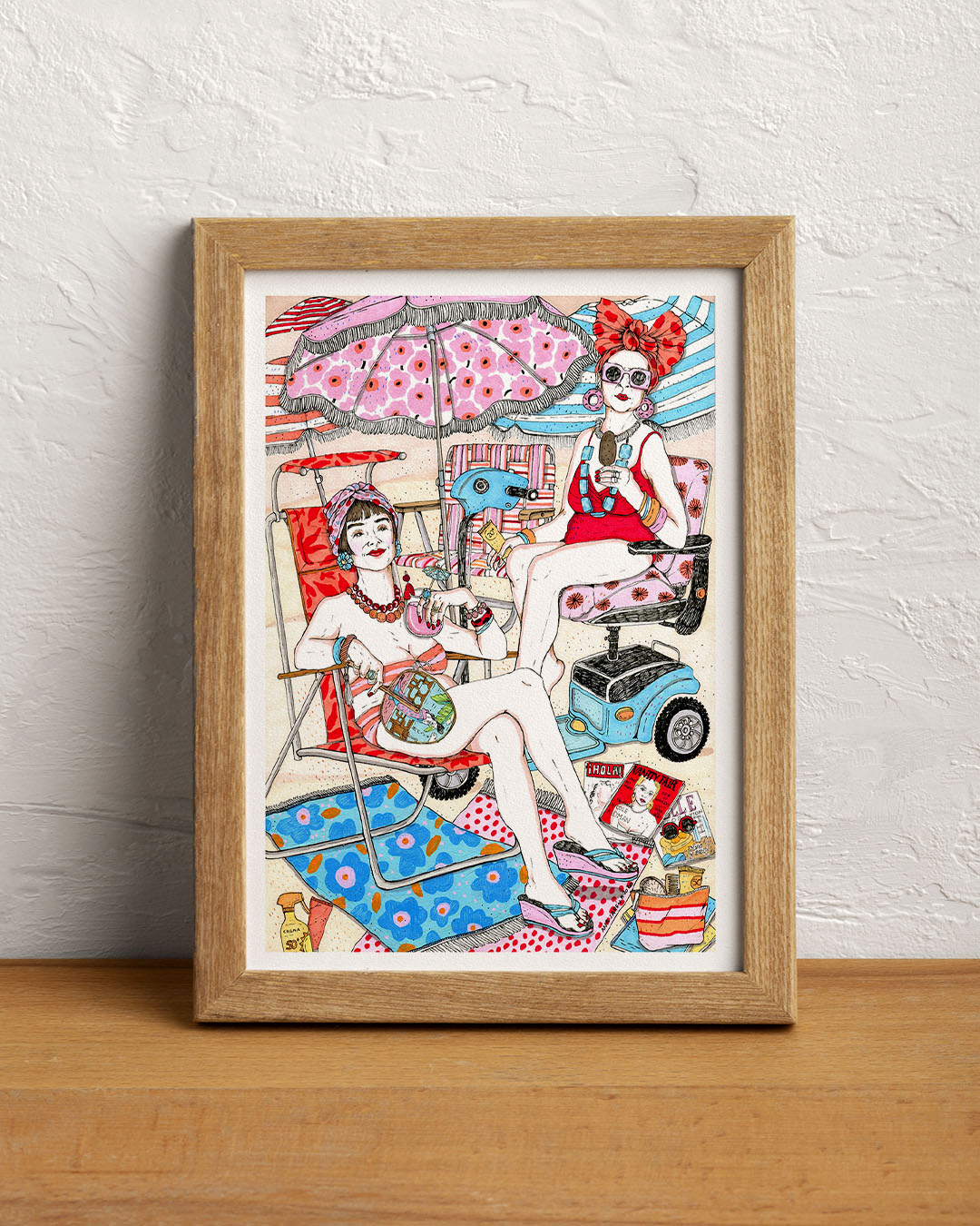 “Beach Ladies” is a fun and colorful art print by illustrator Ana Jarén. This lively illustration features two ladies lounging on beach chairs, enjoying ice cream and drinks under umbrellas, with gossip magazines, sunscreen, and towels scattered around—evoking sun‑drenched holiday vibes and making it a playful piece of decoration.