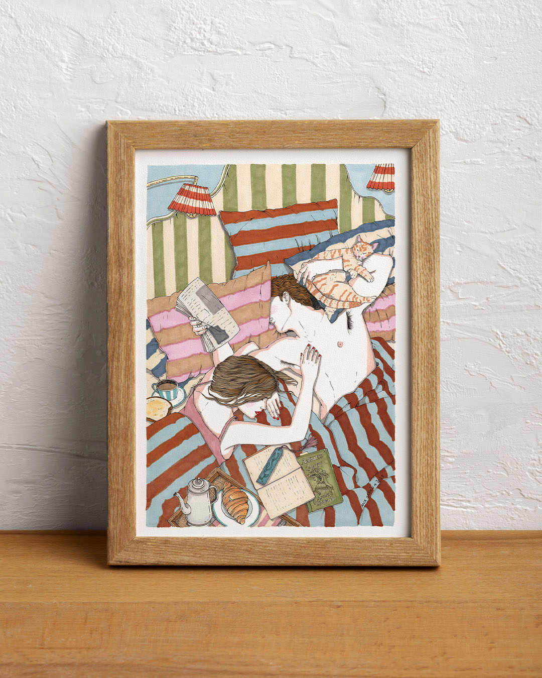 This charming illustration by Ana Jarén—simply titled “Bed”—captures an intimate, cozy bedroom scene where two figures lounge amidst books, food, and a curious cat. The artwork is rendered in Jarén’s signature style: rich in domestic decoration, textiles, and narrative detail, with a warm, slightly naive aesthetic.