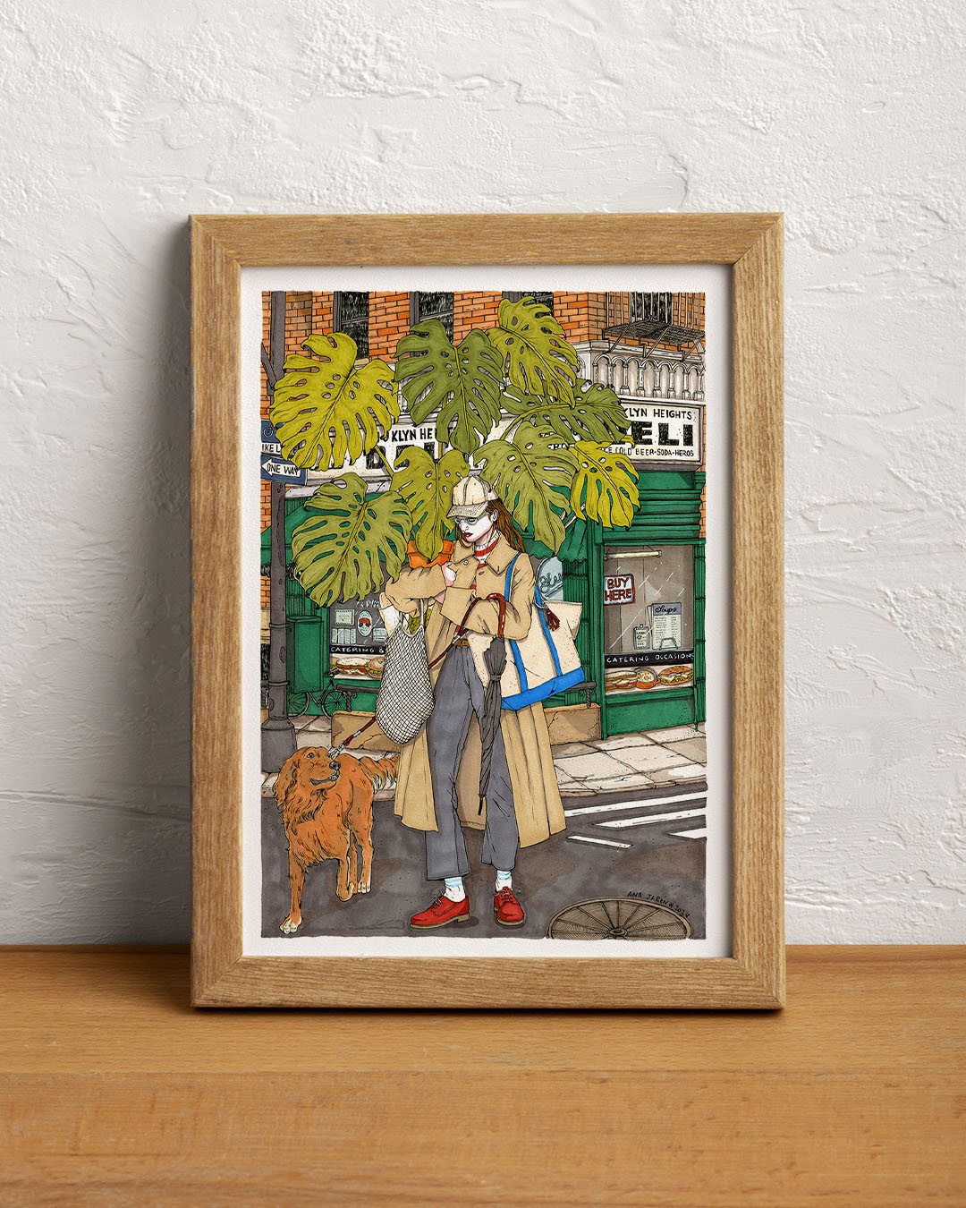 Monstera is a vibrant illustration by Spanish artist Ana Jarén, portraying a woman gracefully carrying a large Monstera plant through a city street while walking her dog and balancing shopping bags and an umbrella. The artwork beautifully reflects Jarén’s signature attention to everyday urban details, fabrics, textures, and domestic flourishes—making it a stylish piece of decoration in line with her narrative-driven aesthetic.