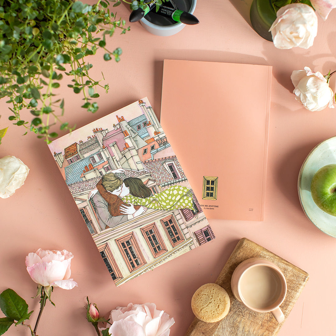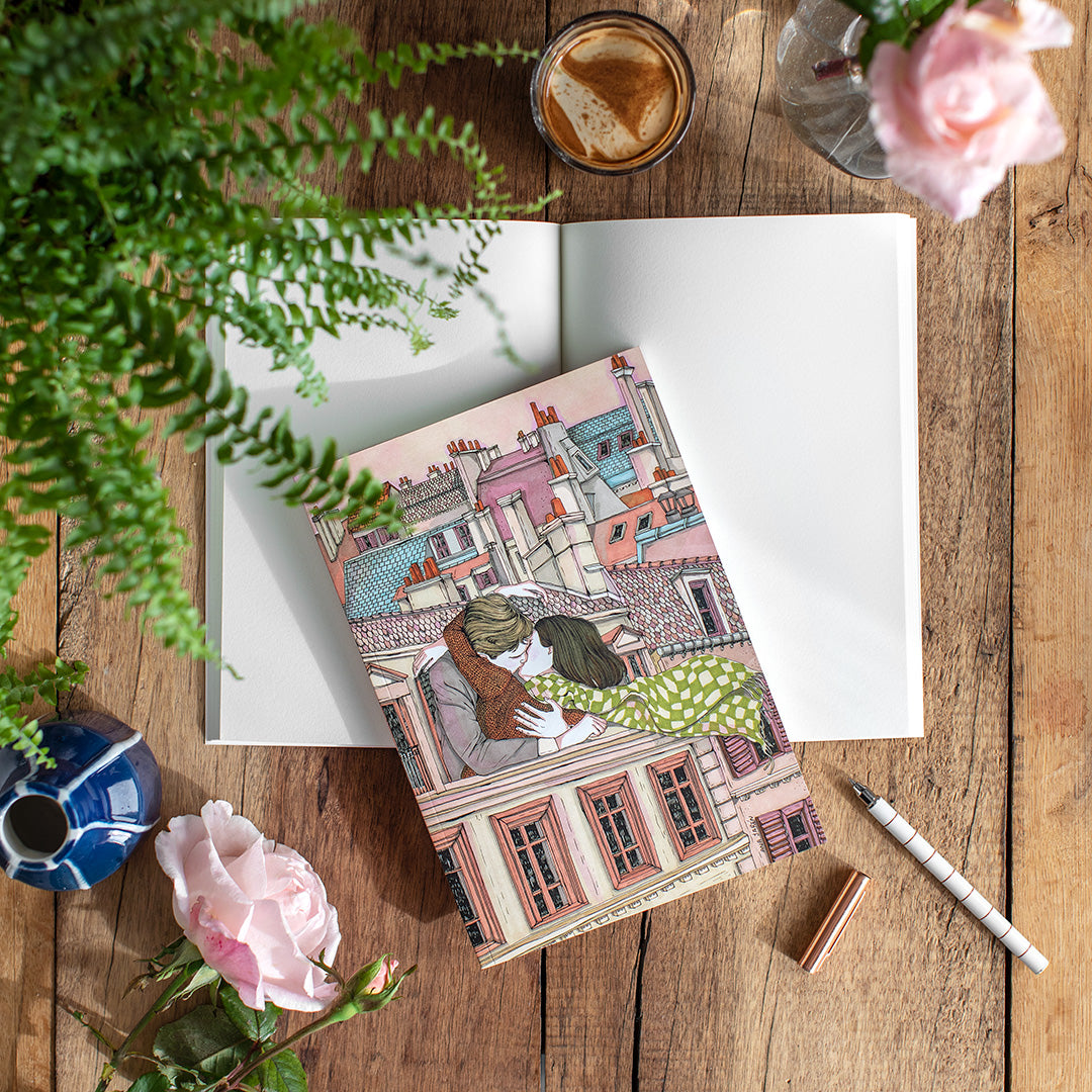 Cuquiland notebook "Kiss Me Anytime", illustrated by Ana Jarén. Format 16 x 23 cm. 112 pages (white/smooth). Natural 120 g marker-proof paper. Sewn binding with spine. Scratch-proof matt laminated covers. Single shrink-wrapped.