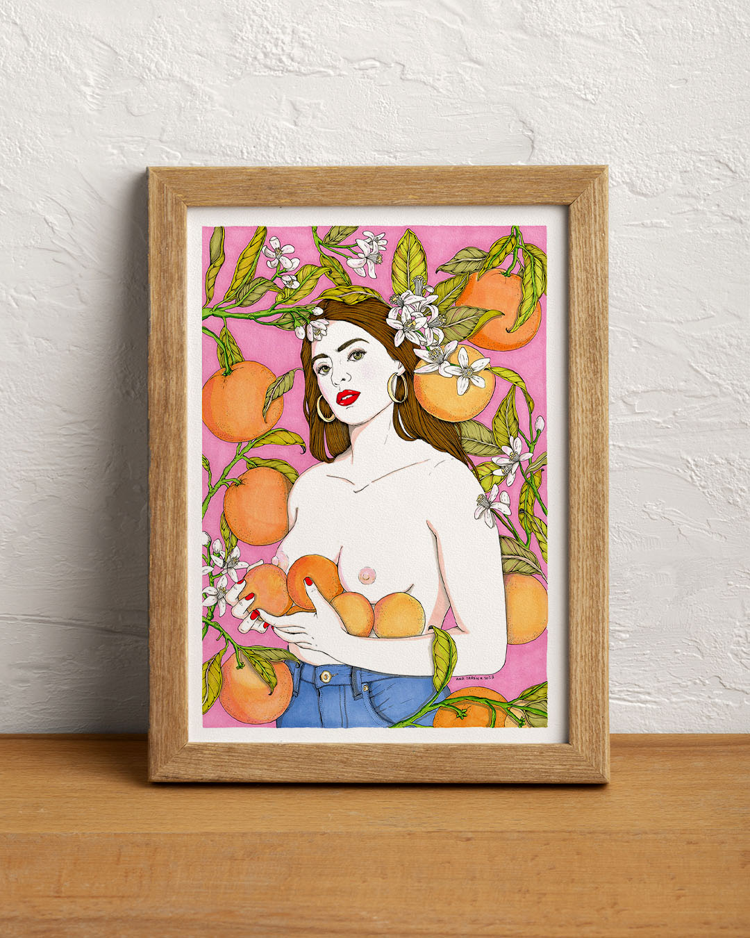 Oranges is a striking illustration by Spanish artist Ana Jarén, featuring a confident woman surrounded by orange blossoms and ripe fruit, set against a bold pink background. With vivid colors and expressive detail, the artwork explores themes of femininity, nature, and sensuality, making it a distinctive piece of decoration full of life and character.